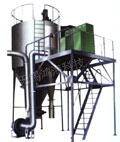 空氣經(jīng)過濾和加熱,進入干燥器頂部空氣分配器,熱空氣呈螺旋狀均勻地進入干燥室。料液經(jīng)塔體頂部的高速離心霧化器,(旋轉)噴霧成細微的霧狀液珠,與熱空氣并流接觸在短的時間內可干燥為成品。成品連續(xù)地由干燥塔底部和旋風分離器中輸出,廢氣由風機排空。