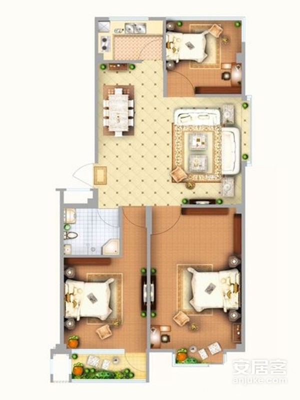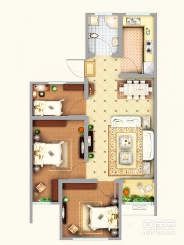 A戶型, 3室2廳1衛(wèi)0廚, 建筑面積約95.00平米