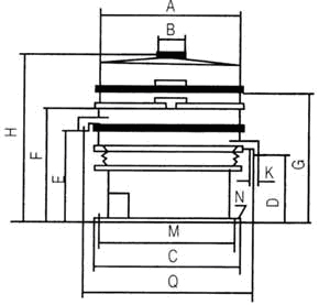F:第三個(gè)出料口離地高度 G:第四個(gè)出料口離地高度 K:出料口直徑 M:底座內(nèi)徑N:地腳孔數(shù)及孔徑 Q:出料口間距